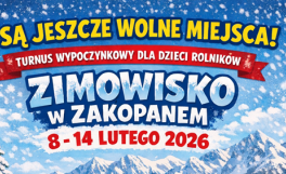 Informujemy, iż są jeszcze wolne miejsca na turnus wypoczynkowy dla dzieci rolników urodzonych po 01 styczniu 2010 roku do 31 grudnia 2021 roku w ośrodku wypoczynkowym:     „ZAKOPIEC” w Zakopanem w terminie  od  8 – 14 luty 2026 roku ! W trakcie turnusu, uczestnicy otrzymują zakwaterowanie,...