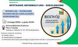 Planujesz rozwinąć działalność gospodarczą? Zapraszamy na spotkanie informacyjno-szkoleniowe dotyczące zasad przyznawania pomocy w ramach działania:  „Rozwijanie pozarolniczej działalności gospodarczej: Rozwój DG” 4 lutego 2026 r. Gminna Biblioteka Publiczna Filia w Twardej (Twarda, ul. Główna 117...